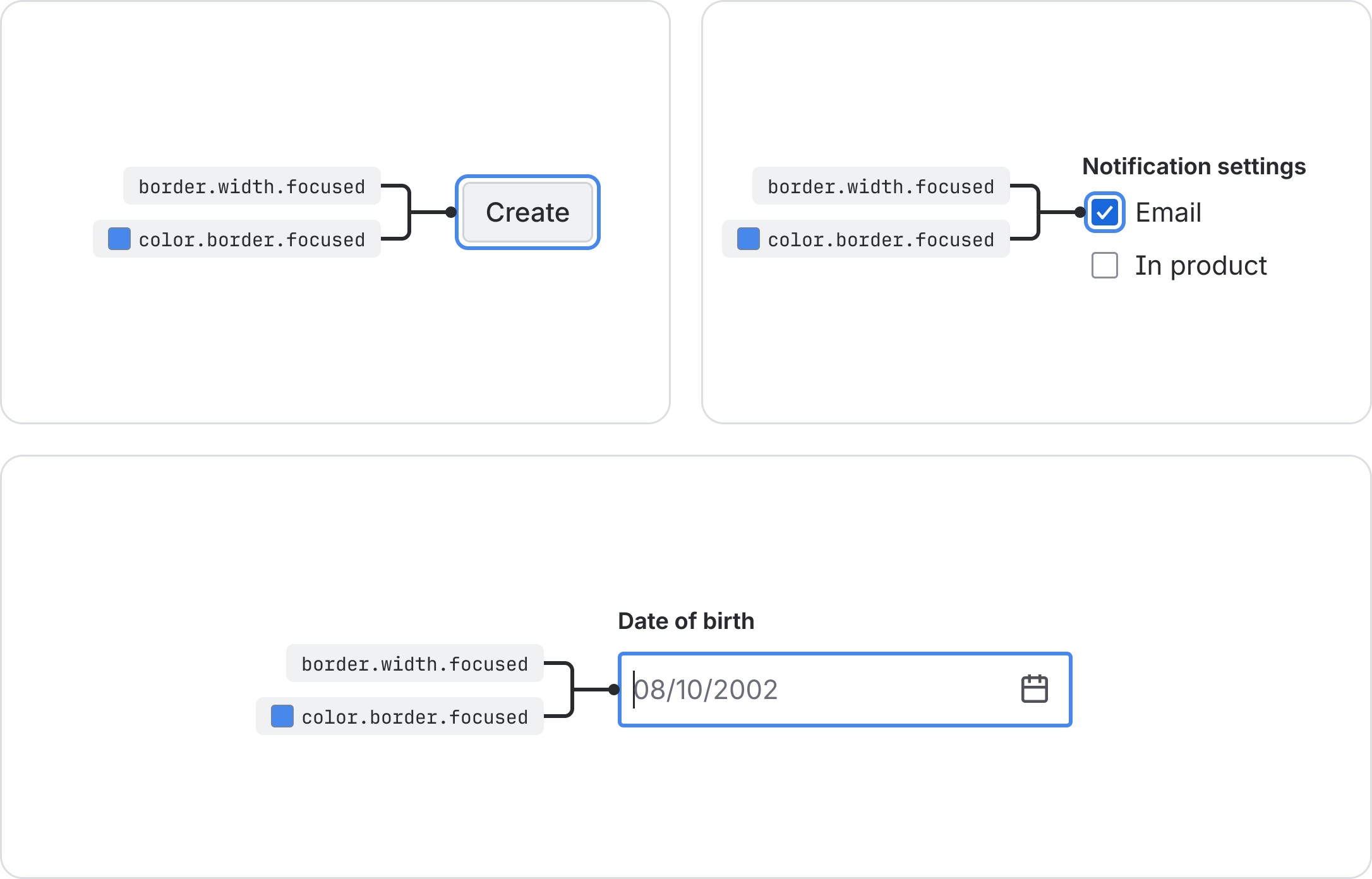 Always pair the border.width.focused token with the color.border.focused token to define the