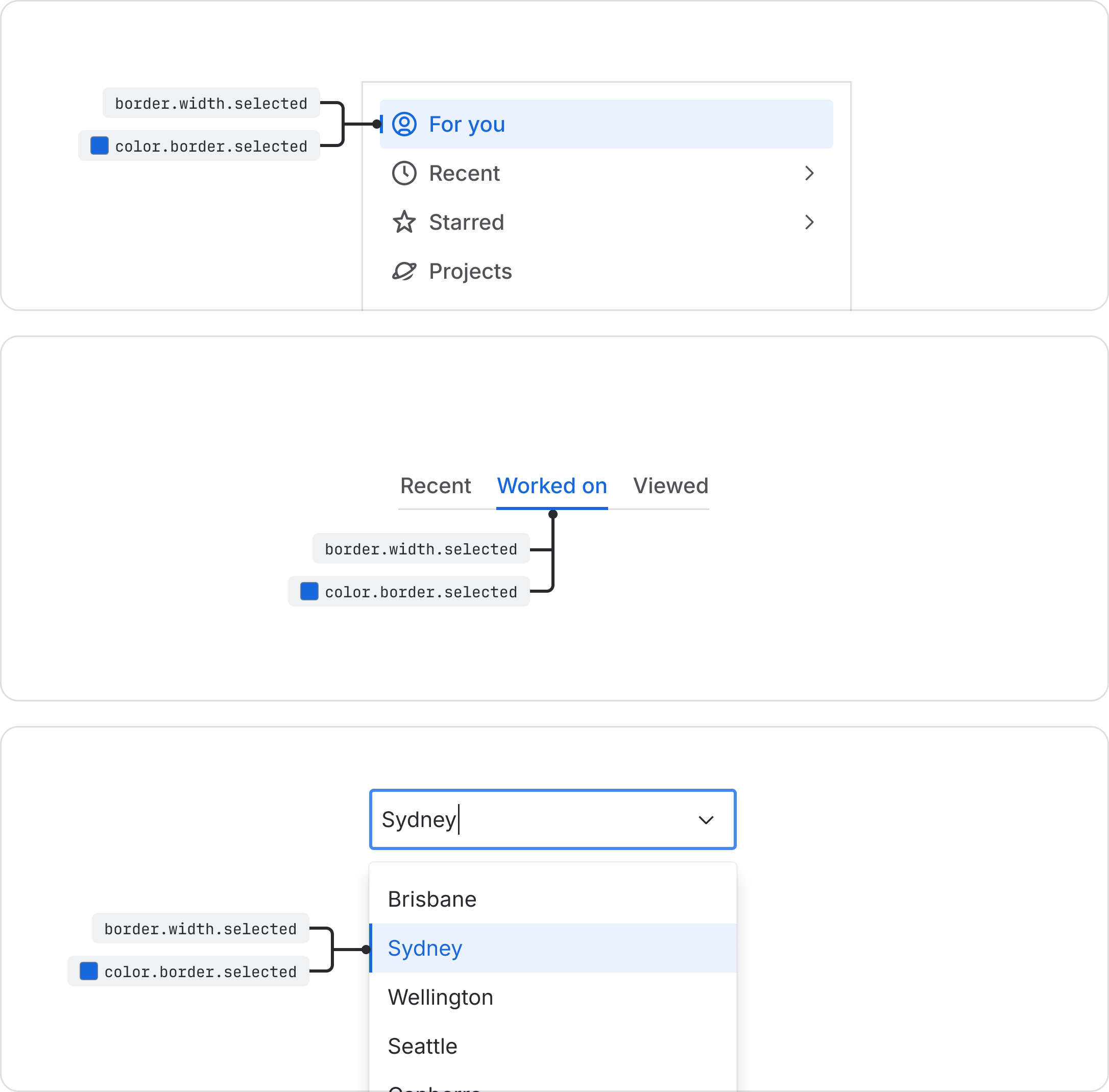 Always pair the border.width.selected token with the color.border.selected token, to show users
