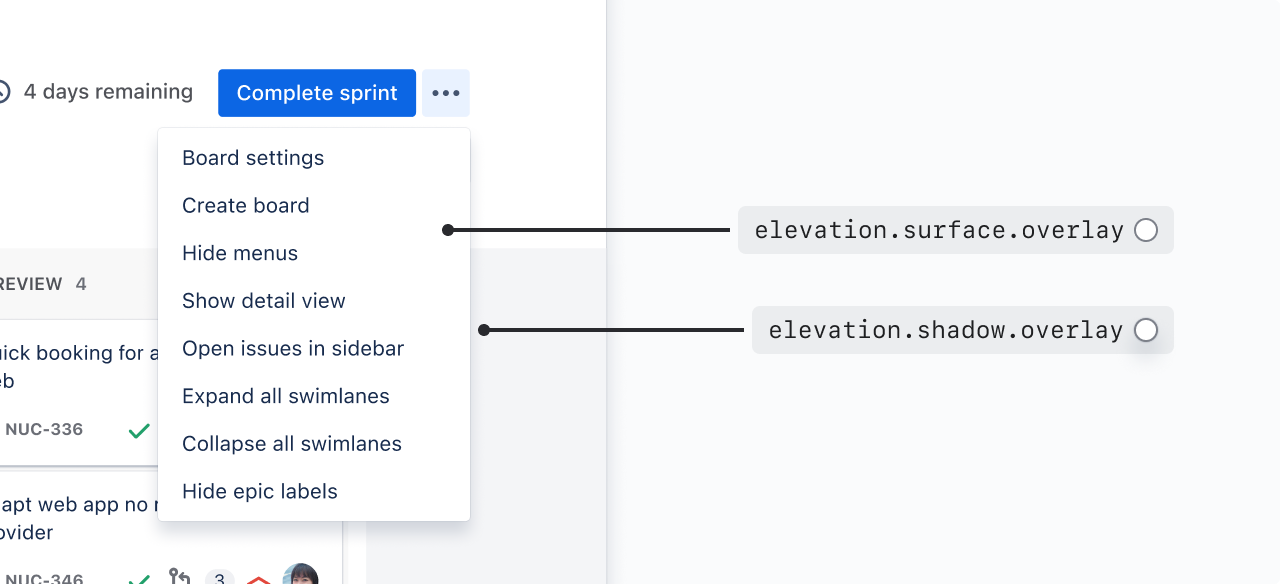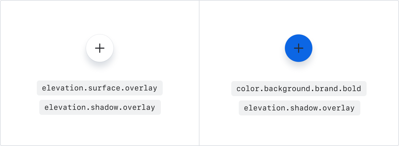 The elevations use design tokens to apply different surface levels. The highest two elevation surfaces, raised and overlay, are paired with shadows to create more depth.