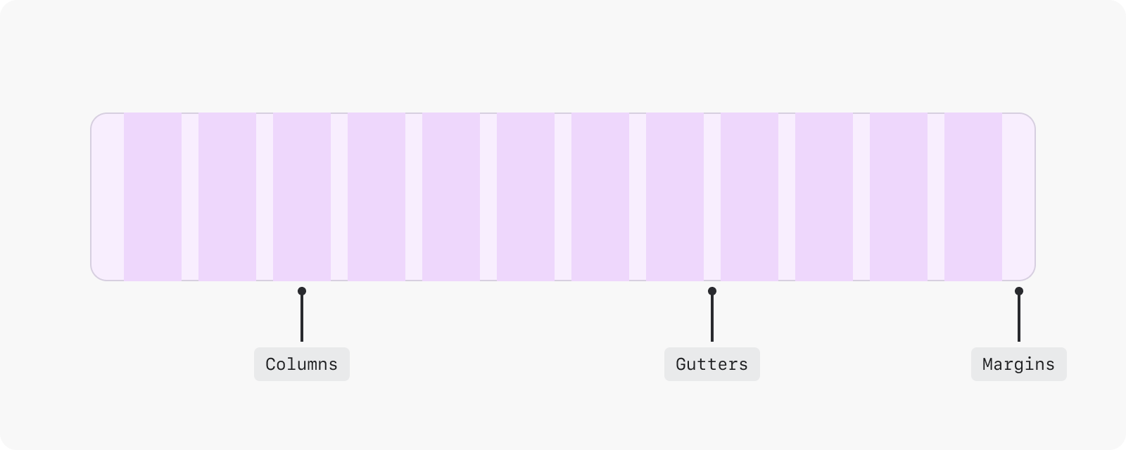 | Breakpoint | Viewport | Columns | Gutters | Margins |