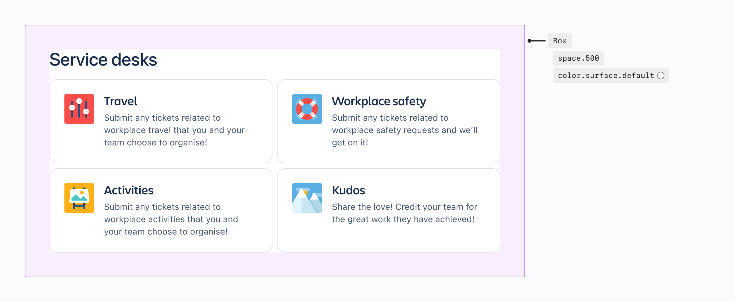 A generic container with managed access to design tokens. Box is a flexible and fundamental building block for a UI, and can be the primary way to apply styling to its contents.