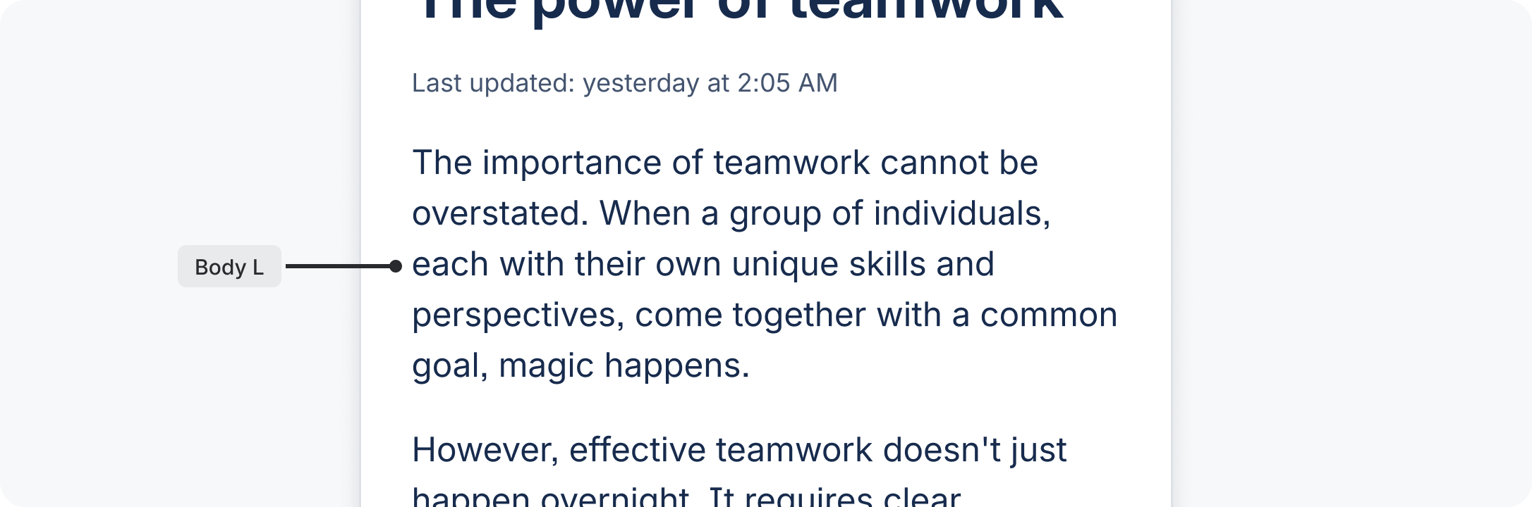 - Body L is the default size for long-form content. Use this size for a comfortable reading experience such as in blogs.