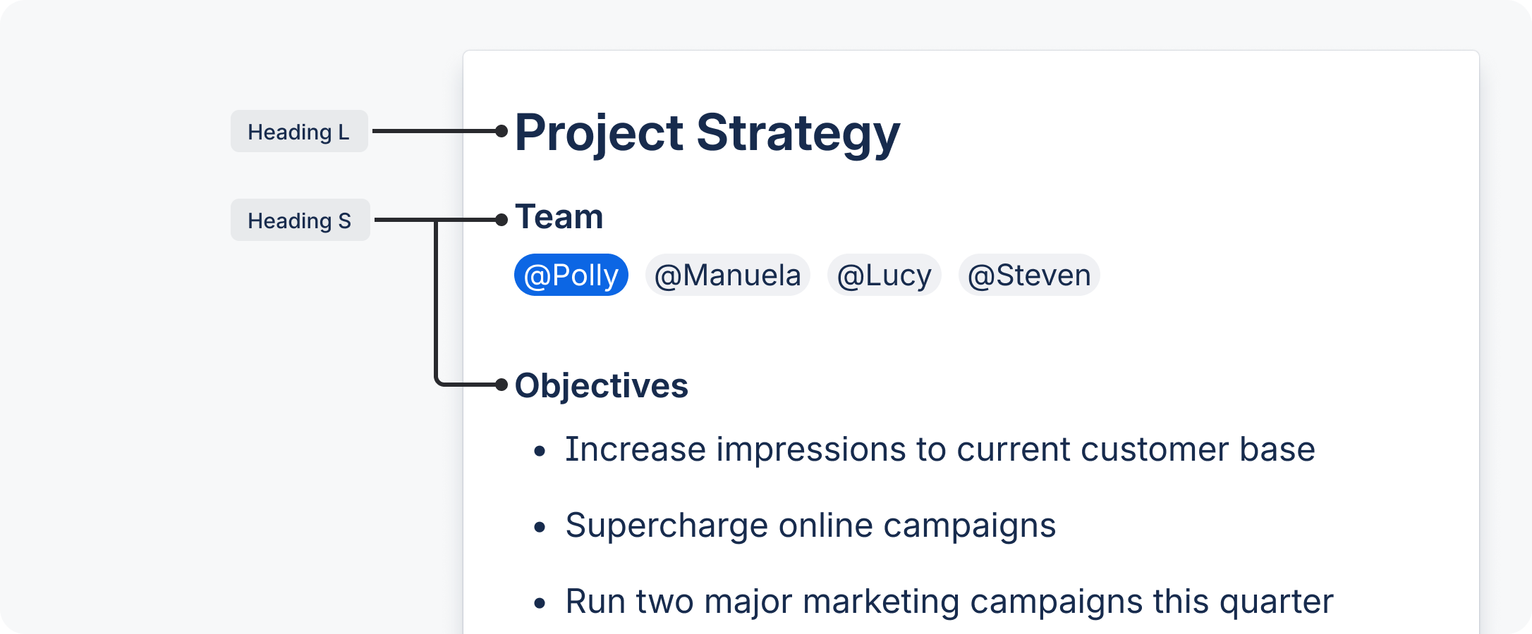 Use headings for page titles or subheadings to introduce content. Headings are sized to contrast with content, increase visual hierarchy, and help readers easily understand the structure of content.